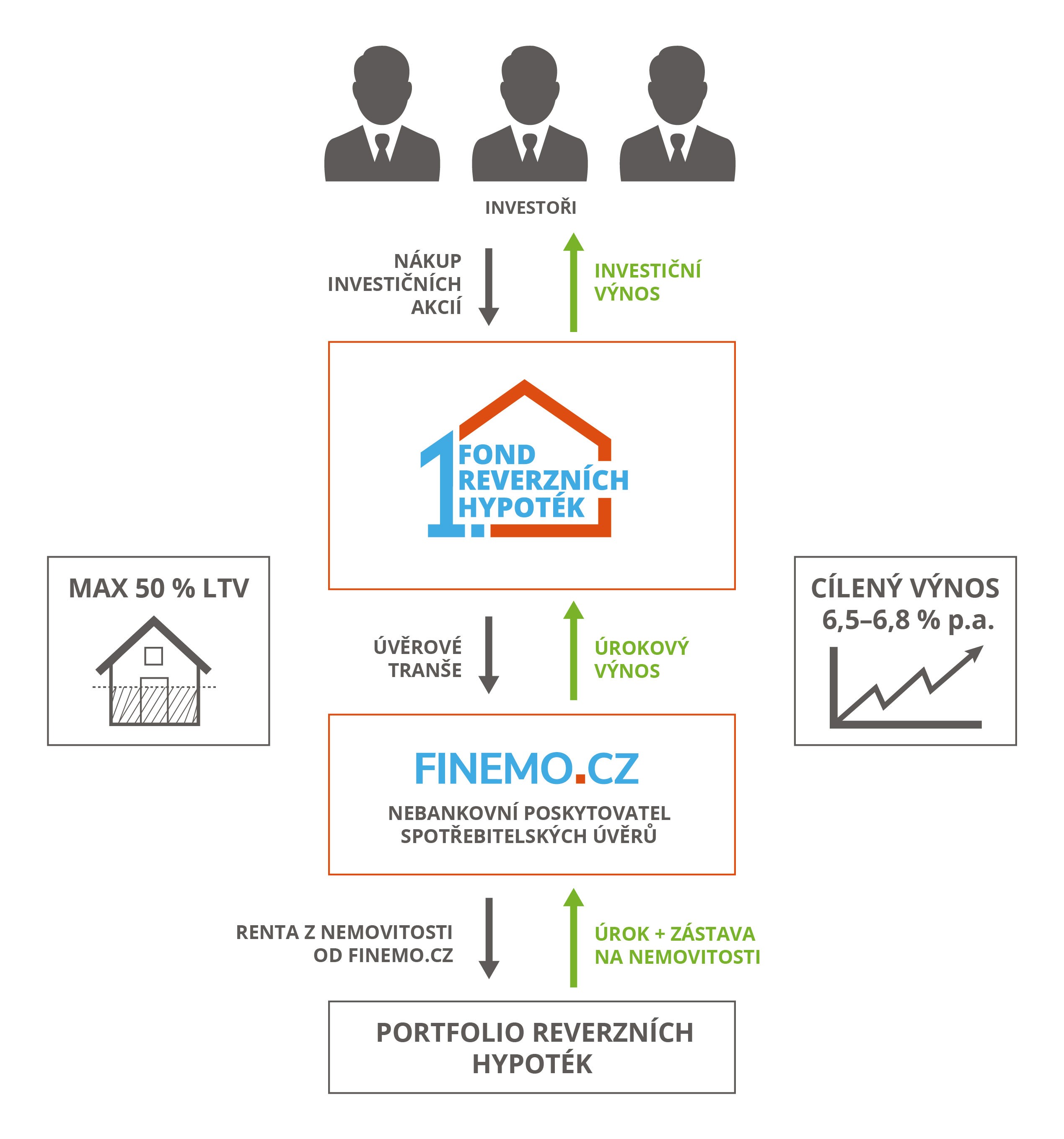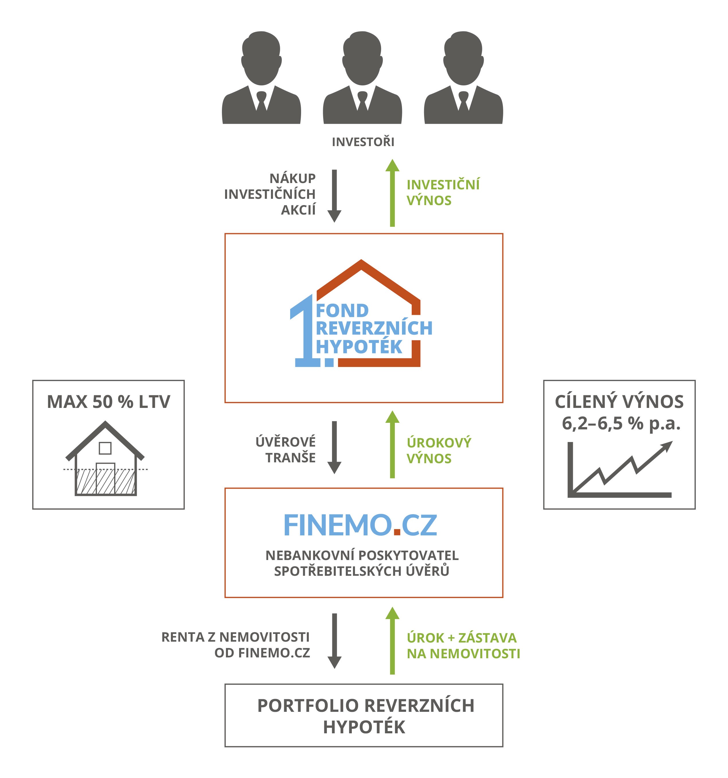 ✔ Fond poskytuje zajištěný úvěr do společnosti FINEMO.CZ SE, která je řízena zakladateli fondu a poskytuje pouze reverzní hypotéky.